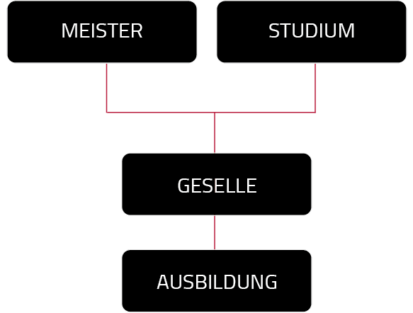 Meister / Bachelor Professional: Durch das erfolgreiche Beenden einer Ausbildung erhältst du automatisch die Mittlere Reife. Außerdem hast du nach der Weiterbildung zum Gesellen die Möglichkeit dich technisch, betriebswirtschaftlich oder gestalterisch zu spezialisieren und mit der Meisterprüfung den Titel des Bachelor Professional anzunehmen.